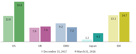 Rising US trade protectionism added to market risks in Q1. The US announced new tariffs on steel and aluminum imports, though most major trading partners were eventually exempted, as well as on Chinese imports amid charges of inadequate intellectual property protections that threaten to further escalate tensions