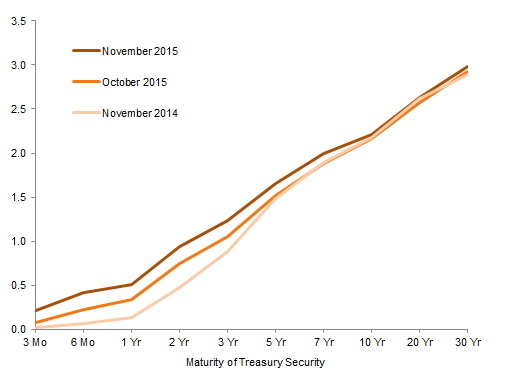 The US Treasury yield curve continued to flatten as short rates rose in anticipation of a December rate hike by the Fed. Long rates remain well anchored along with inflation expectations, and US Treasuries overall only suffered minor losses in November