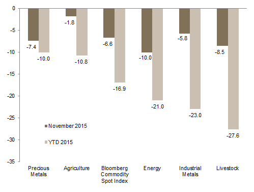 Commodity prices suffered steep declines across most categories in November, with energy and industrial metals prices among the worst performers. Oversupply and falling demand from China continue to be major drivers, as is bearish investor positioning