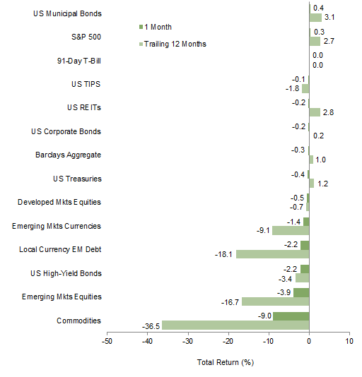 Inflation-sensitive assets were nearly all in the red, but some more than others. Commodities (-7.3% for the Bloomberg Commodity Total Return Index and -9.0% for the energy-heavy S&P GSCI™) suffered sharp declines led by falling energy and industrial metals prices. Prices for crude oil ($41.65 for WTI and $44.61 for Brent) approached their 2015 lows amid rising oil inventories and no signals from the Saudi-led OPEC cartel of any near-term change in production policy. Industrial metals prices fell 5.8% as the supply glut shows no signs of abating despite clearly falling Chinese demand. Precious metals prices, which fell 7.4%, are similarly exposed to supply/demand imbalances, with gold savers also sensitive to changes in US interest rate policy as prices fell nearly 7%. Energy master limited partnerships (-8.1%) gave back most of their October gains, while natural resources equities (-1.6%) sustained more modest losses, though the headline performance concealed a sharp sell-off in metals and mining stocks. Rate-sensitive US REITs (-0.2%) were resilient despite the prospects for a December rate hike, while yields on US Treasury Inflation-Protected Securities, which returned -0.1% for the month, continued to move further into positive territory.