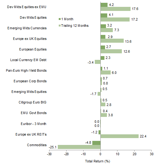 Developed markets equities outperformed all other asset classes in euro terms. The weak euro meant even declining international assets like emerging markets equities and US high-yield bonds generated positive returns for euro investors. Commodities and Europe ex UK REITs suffered the only losses