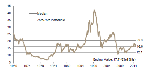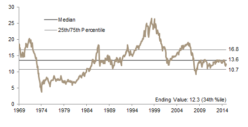 The composite normalized P/E ratio is calculated by dividing the inflation-adjusted index price by the simple average of three normalized earnings metrics: ten-year average real earnings (i.e., Shiller earnings), trend-line earnings, and return on equity–adjusted earnings. We have removed the bubble years 1998–2000 from our mean and standard deviation calculations. All data are monthly.