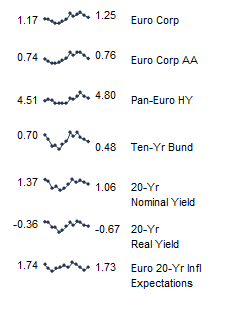 European fixed income yields reflect the BofA Merrill Lynch Euro Corporate AA Bond Index, BofA Merrill Lynch Euro Corporate Bond Index, Barclays Pan-European Aggregate High Yield Bond Index, Bloomberg Twenty-Year European Government Bond Index (nominal), ten-year German bund, 20-year European Inflation Swaps (inflation expectations), and the real yield calculated as the difference between the inflation expectation and nominal yield.