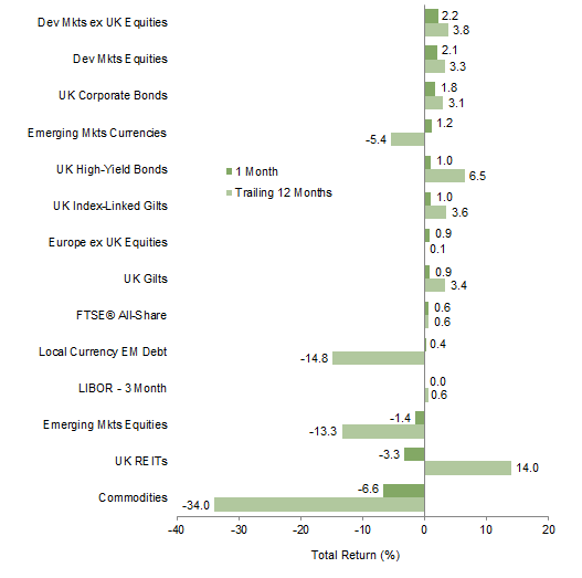 Despite a slight gain, UK equities continued to underperform developed markets peers as well as both domestic investment-grade and high-yield bonds. Emerging markets equities and commodities suffered losses and underperformed UK equities, as they have for the year. UK REITs also declined but have meaningfully outperformed all asset classes on a year-to-date basis