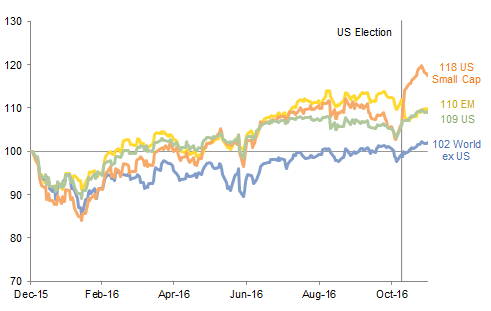 US equities bounced in November, as the market began to price in better growth potential following the election. US small caps in particular outperformed given expectations of lower taxes and fiscal stimulus boosting domestic growth and shareholder returns. Strong US equity performance helped push up returns for developed markets, while emerging markets underperformed as sentiment turned negative