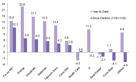 The implications of the recent economic and political developments are potentially significant for multiple asset classes. Improving economic fundamentals and a shift toward more balanced economic policies could spell the end to the 35-year bond bull market as sovereign yields price in the potential for higher growth and/or inflation. The reflation trade also has important consequences for global equities from a factor and sector standpoint. The seismic shifts observed in the bond market in recent months have contributed to a rotation within the equity market away from lower-beta, defensive stocks—whether the quality growth names or the high-yielding bond proxies that investors have favored in recent years—and into higher-beta, cyclical names geared to higher growth, inflation, and interest rates. The outperformance of value indexes over their growth counterparts that began a year ago has accelerated in recent months as a result of higher concentration within cyclical sectors like financials. Bank stocks in particular significantly outperformed in November, as recent events suggest that some relief may soon come from the heavy regulatory burden and financial repression that has characterized the post–global financial crisis environment.
