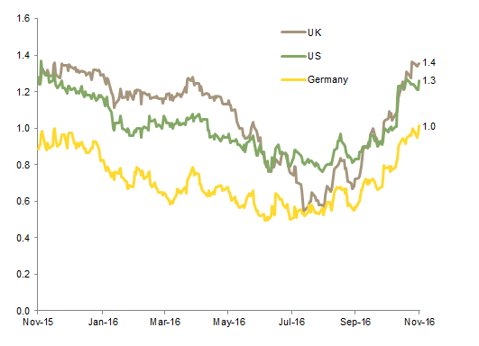 Global developed markets government bonds (-1.9%) corrected further amid sharp yield increases and steeper curves in most regions. Ten-year yields for US, UK, and German sovereigns jumped 53 bps, 19 bps, and 11 bps, respectively. The entire US yield curve shifted higher and now sits above levels of a year ago, just prior to the Fed’s first rate hike of this cycle. US Treasuries (-2.7%) suffered their worst month since January 2009 as the market priced in a combination of better economic data, with the latest estimate of third quarter GDP growth revised up to 3.2%, and expectations for higher growth and/or inflation from the incoming government’s proposed policies. US tax-exempt bonds (-3.7%) also dropped the most since the depths of the global financial crisis as President-elect Trump’s policy proposals could hurt demand while boosting supply. UK gilts (-1.3%) also declined on better than expected economic data as well as expectations of increased supply as the British government announced greater debt-financed spending plans in the coming years to support the economy through Brexit. Global linkers (-2.7%) underperformed nominal bonds, primarily due to a correction in UK linkers (-5.4%); US TIPS (-1.9%) outperformed Treasuries in contrast. US high-yield corporates (-0.5%) were supported by higher commodity prices and growth expectations, outperforming investment-grade equivalents (-2.7%), which performed in line with US government bonds.