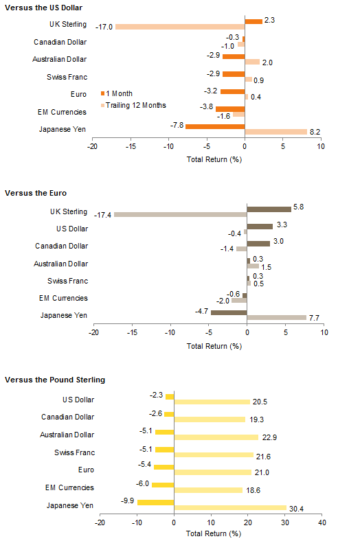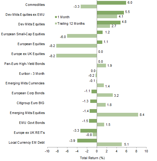 Euro weakness magnified returns for USD-denominated assets, with commodities generating the highest returns. Developed markets equities outperformed European equivalents, which also gained but entirely due to exposure to a stronger British pound. Europe ex UK equities and pan-European high-yield bonds were flat, while investment-grade European bonds retreated, along with emerging markets assets and Europe ex UK REITs