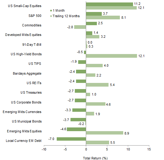 US equities outperformed, with US small caps rallying over 11%, their best month since October 2011. Commodities also gained as energy and industrial metals prices rallied and more than offset weakness in precious metals. US bonds experienced sharp corrections, with the exception of high-yield bonds, which benefitted from rising commodity prices and higher growth expectations. Losses suffered by emerging markets assets were magnified by US dollar strength