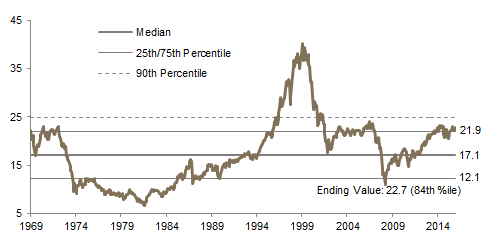 The composite normalized P/E ratio is calculated by dividing the inflation-adjusted index price by the simple average of three normalized earnings metrics: ten-year average real earnings (i.e., Shiller earnings), trend-line earnings, and return on equity–adjusted earnings. We have removed the bubble years 1998–2000 from our mean and standard deviation calculations. All data are monthly.