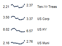 US fixed income yields reflect Bloomberg Barclays Municipal Bond Index, Bloomberg Barclays US Corporate High-Yield Bond Index, Bloomberg Barclays US Corporate Investment-Grade Bond Index, and the ten-year Treasury.