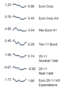 European fixed income yields reflect the BofA Merrill Lynch Euro Corporate AA Bond Index, BofA Merrill Lynch Euro Corporate Bond Index, Barclays Pan-European Aggregate High Yield Bond Index, Bloomberg Twenty-Year European Government Bond Index (nominal), ten-year German bund, 20-year European Inflation Swaps (inflation expectations), and the real yield calculated as the difference between the inflation expectation and nominal yield.