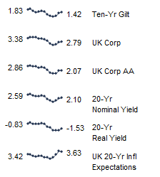 UK sterling fixed income yields reflect the BofA Merrill Lynch Sterling Corporate AA Bond Index, BofA Merrill Lynch Sterling Corporate Bond Index, UK ten-year gilts, and Bank of England 20-year nominal, real, and zero coupon (inflation expectations) yields.