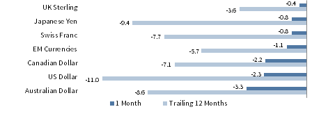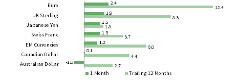 The euro strengthened against all major currencies and our EM currency basket over the past month and the trailing 12 months as the Eurozone’s economic recovery progressed and currency markets anticipated less accommodative policy from the European Central Bank.