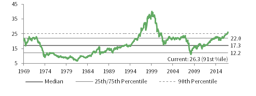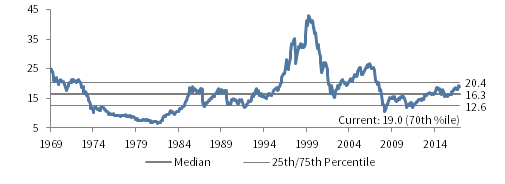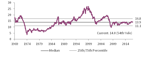 The composite normalized P/E ratio is calculated by dividing the inflation-adjusted index price by the simple average of three normalized earnings metrics: ten-year average real earnings (i.e., Shiller earnings), trend-line earnings, and return on equity–adjusted earnings. We have removed the bubble years 1998–2000 from our mean and standard deviation calculations. All data are monthly.