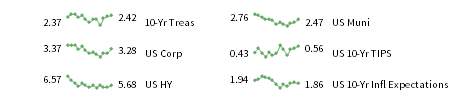 US fixed income yields reflect Bloomberg Barclays Municipal Bond Index, Bloomberg Barclays US Corporate High-Yield Bond Index, Bloomberg Barclays US Corporate Investment-Grade Bond Index, and the ten-year Treasury.