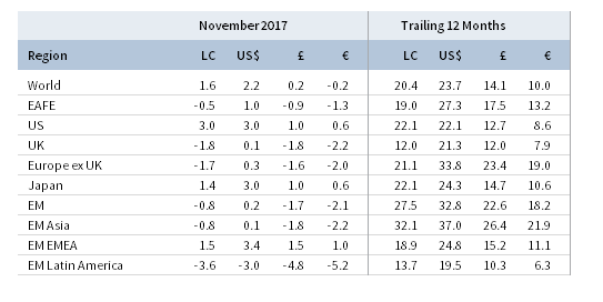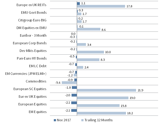Capital markets performance was mixed in November as political developments took the spotlight from improving macroeconomic conditions and strong earnings results. Global equities advanced for the 13th consecutive month in US dollar but were flat in UK sterling and declined in euro. Developed markets outperformed emerging markets for the second time in three months, and global growth stocks continued to outperform value counterparts, though by a slim margin as technology stocks experienced a sharp sell-off late in the month. Global government bonds underperformed global equities with yield curves flattening across major economies. Real assets returns were mixed as commodities, global natural resources equities, and global REITs advanced, while energy MLPs declined. Among currencies, the euro and UK sterling strengthened, while the US dollar declined.