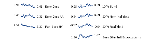 European fixed income yields reflect the BofA Merrill Lynch Euro Corporate AA Bond Index, BofA Merrill Lynch Euro Corporate Bond Index, Barclays Pan-European Aggregate High Yield Bond Index, Bloomberg Twenty-Year European Government Bond Index (nominal), ten-year German bund, 20-year European Inflation Swaps (inflation expectations), and the real yield calculated as the difference between the inflation expectation and nominal yield.