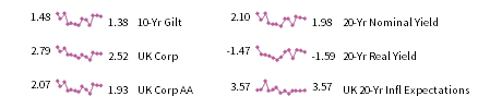 UK sterling fixed income yields reflect the BofA Merrill Lynch Sterling Corporate AA Bond Index, BofA Merrill Lynch Sterling Corporate Bond Index, UK ten-year gilts, Bank of England 20-year nominal yields, and Bloomberg Generic UK 20-year inflation-linked (real) yields. Current UK 20-year nominal yield data are as of November 29, 2017.