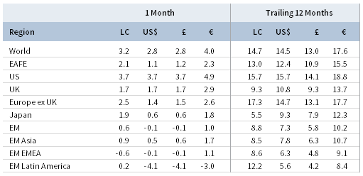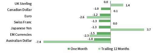 Rising bond yields weighed on sovereign fixed income performance, whereas corporate credits fared better. US high-yield (0.3%) and corporate investment-grade bonds (0.3%) outperformed US Treasuries (-0.3%) amid higher yields and tighter credit spreads. Five- and ten-year Treasury yields rose 11 and 9 basis points (bps) to 1.62% and 1.78%, respectively, but pared back from higher levels intra-month. Short-term rates rose to a lesser degree, expanding the 10-year/3-month yield spread to its widest month-end level since February. As in the United States, UK gilts (-0.8%) underperformed UK high-yield (1.2%) and corporate investment-grade (-0.1%) counterparts. Five- and ten-year gilt yields climbed 6 bps apiece to 0.46% and 0.66%, respectively. EMU government bonds (-0.9%) also declined as German ten-year bund yields rose to -0.35%. US tax-exempt municipal bonds (0.3%) and TIPS (0.2%) outperformed nominal Treasuries as inflation expectations climbed, while, in the United Kingdom, linkers (-1.7%) underperformed nominal gilts.