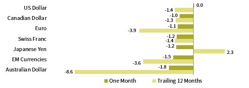 Among major currencies, the US dollar and UK sterling broadly appreciated, while the euro was mixed. The US dollar advanced against most currencies we track, appreciating the most against the Australian dollar, our equal-weighted emerging markets currency basket, and the Japanese yen; the greenback was effectively flat against the UK sterling. The dollar was mixed over the trailing 12 months. The euro strengthened the most against the Australian dollar, EM currencies, and the Japanese yen, but declined the most relative to the US dollar and UK sterling. The common currency was broadly weaker over the past year, but appreciated against the Australian dollar. UK sterling advanced against most currencies in November, yet was essentially flat versus the US dollar. Sterling appreciated over the past year against all but the Japanese yen.