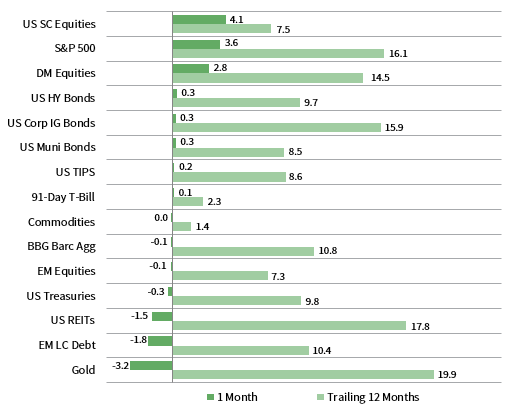 US and DM equities outperformed in November, while other asset classes experienced more muted returns. US small caps bested large caps, while US stocks outperformed non-US equivalents. HY and IG corporates outgained Treasuries as yields moved higher. REITs and gold declined, but returned the most over the past year.