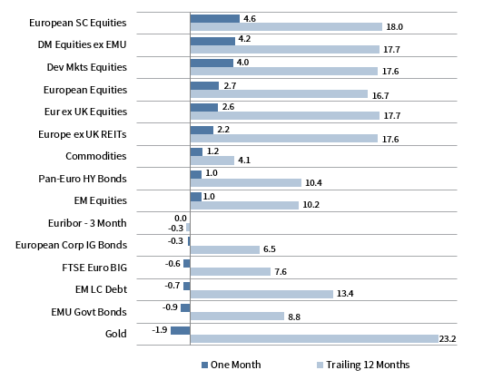 Equities gained the most, whereas safe-haven government bonds and gold declined. European small caps bested large-cap counterparts, while European stocks in aggregate underperformed broader developed markets peers. HY delivered the lone fixed income gain, outperforming IG corporate and sovereign bonds.