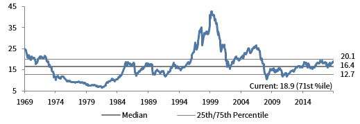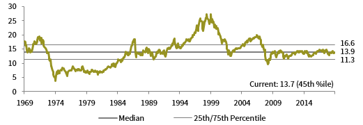 The composite normalized P/E ratio is calculated by dividing the inflation-adjusted index price by the simple average of three normalized earnings metrics: ten-year average real earnings (i.e., Shiller earnings), trend-line earnings, and return on equity–adjusted earnings. We have removed the bubble years 1998–2000 from our mean and standard deviation calculations. All data are monthly.