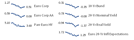European fixed income yields reflect the BofA Merrill Lynch Euro Corporate AA Bond Index, BofA Merrill Lynch Euro Corporate Bond Index, Bloomberg Barclays Pan-European Aggregate High Yield Bond Index, Bloomberg Twenty-Year European Government Bond Index (nominal), ten-year German bund, 20-year European Inflation Swaps (inflation expectations), and the real yield calculated as the difference between the inflation expectation and nominal yield.