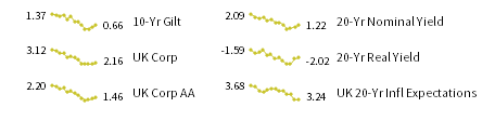UK sterling fixed income yields reflect the ICE BofAML Sterling Corporate AA Bond Index, ICE BofAML Sterling Corporate Bond Index, UK ten-year gilts, Bank of England 20-year nominal yields, and Bloomberg Generic UK 20-year inflation-linked (real) yields.