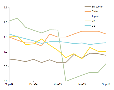 In Europe, EMU (9.7%) and Europe ex UK (8.2%) equities continue to outpace UK equivalents (5.2%). UK-listed large caps are expected to suffer third quarter year-on-year earnings declines north of 20%, largely driven by further profit losses among natural resources equities. Earnings growth appears to be holding up better on the Continent in aggregate, given the rebound in the financial sector and tailwind from a cheaper currency, though slashed forecasts for Volkswagen and companies selling into emerging markets have led to some minor downgrades elsewhere. Strong earnings are anticipated in the Netherlands, Portugal, and Spain, while estimates for other European countries are weaker by comparison, with flat earnings estimated in Germany and declines expected in France and Switzerland.