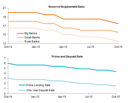 China took further steps to loosen its monetary policy in October, cutting its benchmark lending and deposit rates by 25 bps each, while lowering its bank reserve requirement ratios by another 50 bps