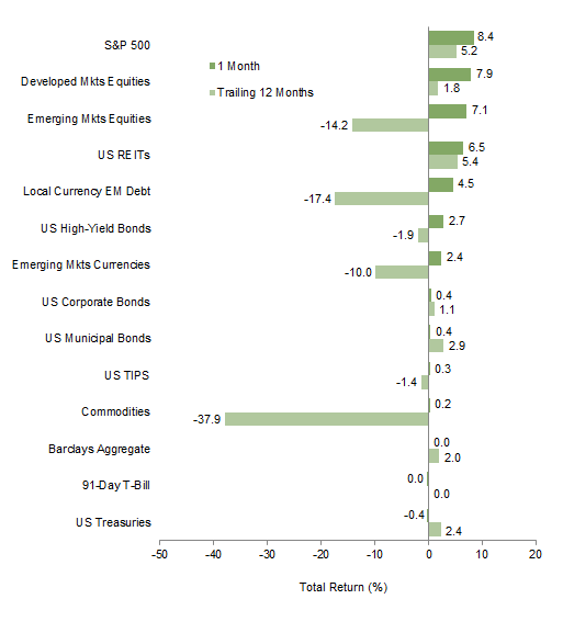 October saw a strong rally in risk assets as accommodative stances from major central banks, more stable commodity prices, and reasonable earnings releases supported investors’ renewed risk appetites. Asset classes that suffered the greatest declines last quarter led performance this month. Natural resources equities, energy master limited partnerships, and Japanese stocks all rebounded roughly 10% in October following double-digit third quarter losses for each. Emerging markets, EMU, and US equities also experienced strong gains, as did global high-yield bonds.
