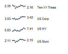 US fixed income yields reflect Barclays Municipal Bond Index, Barclays US Corporate High Yield Bond Index, Barclays US Corporate Investment-Grade Bond Index, and the ten-year Treasury.