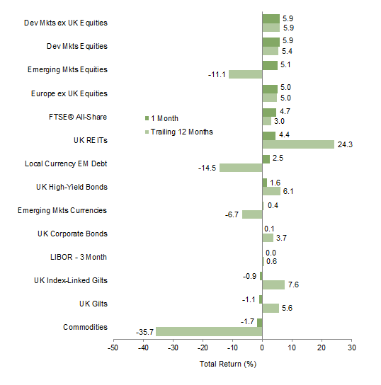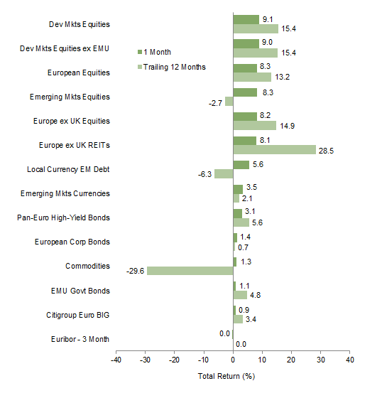 Developed markets equities led the strong rebound in risk assets, with a weaker euro causing EMU equities to slightly underperform international developed markets and emerging markets equivalents. Euro-denominated bonds enjoyed more muted gains, with high-yield bonds outperforming their investment-grade counterparts