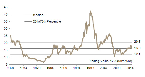 The composite normalized P/E ratio is calculated by dividing the inflation-adjusted index price by the simple average of three normalized earnings metrics: ten-year average real earnings (i.e., Shiller earnings), trend-line earnings, and return on equity–adjusted earnings. We have removed the bubble years 1998–2000 from our mean and standard deviation calculations. All data are monthly.