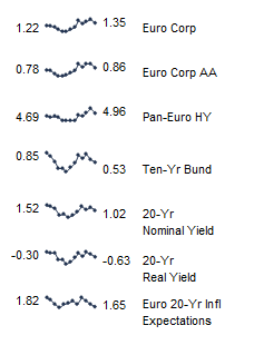 European fixed income yields reflect the BofA Merrill Lynch Euro Corporate AA Bond Index, BofA Merrill Lynch Euro Corporate Bond Index, Barclays Pan-European Aggregate High Yield Bond Index, Bloomberg Twenty-Year European Government Bond Index (nominal), ten-year German bund, 20-year European Inflation Swaps (inflation expectations), and the real yield calculated as the difference between the inflation expectation and nominal yield.