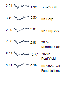 UK sterling fixed income yields reflect the BofA Merrill Lynch Sterling Corporate AA Bond Index, BofA Merrill Lynch Sterling Corporate Bond Index, UK ten-year gilts, and Bank of England 20-year nominal, real, and zero coupon (inflation expectations) yields.