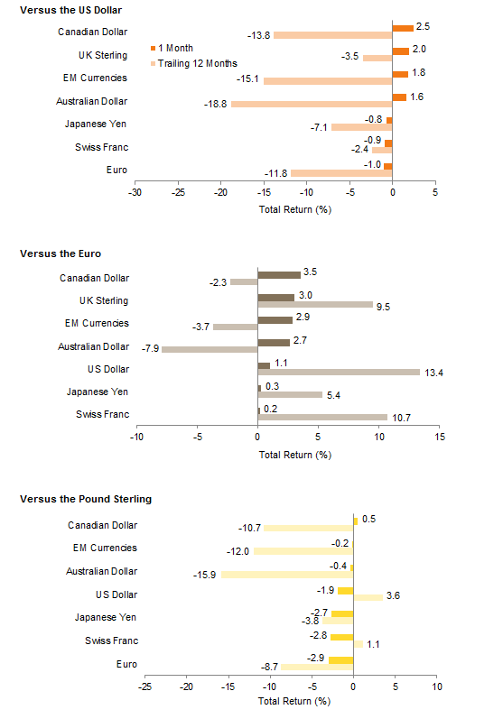 The US dollar (0.6% based on the US dollar index) strengthened modestly against the euro and yen in anticipation of further quantitative easing from the ECB and BOJ. In contrast, the pound sterling appreciated against the dollar after a more hawkish statement out of the BOE following its most recent policy meeting. Emerging markets and commodity currencies also strengthened as commodity prices stabilized, while a stable Chinese yuan in October allayed, for the time being, investor fears regarding the risks of deepening currency wars in Asia.