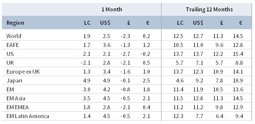 Emerging markets equities (4.2% in USD, 1.8% in EUR, -0.8% in GBP) outperformed developed equivalents in major currency terms for the first time since January, supported by a weakening US dollar. While emerging markets trail significantly year-to-date, underperformance over the trailing 12 months narrowed to about one percentage point in major and local currency terms. Among regions in major currency terms, heavily weighted emerging Asia and Latin America outperformed, whereas emerging Europe, the Middle East & Africa underperformed broader emerging stocks. Latin America trailed other regions in local currency terms, but relative Brazilian real strength boosted currency-translated returns. All major emerging markets countries advanced, led by Taiwan, India, and China. China’s year-over-year GDP growth slowed more than expected in third quarter, as the effects of the ongoing trade war continue to weigh on the domestic economy. India’s central bank cut its benchmark policy rate for the fifth time in as many meetings, following September’s corporate tax cuts, in an effort to support the slowing economy. Russia, the seventh-largest emerging markets component, was the top-performing market in October and over the past year. Frontier markets equities (0.8% in USD, -1.5% in EUR, -4.0% in GBP) underperformed developed and emerging counterparts.