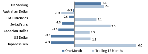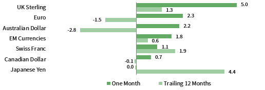 European small caps and EM equities outperformed large-cap and developed counterparts, respectively. Europe ex UK stocks outgained the broader developed markets index. High-yield bonds delivered the lone gain among domestic bonds as yields rose, outperforming invesment-grade corporate and government bond peers.