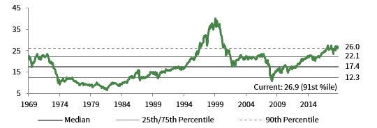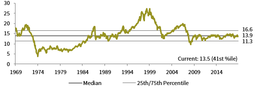 The composite normalized P/E ratio is calculated by dividing the inflation-adjusted index price by the simple average of three normalized earnings metrics: ten-year average real earnings (i.e., Shiller earnings), trend-line earnings, and return on equity–adjusted earnings. We have removed the bubble years 1998–2000 from our mean and standard deviation calculations. All data are monthly.