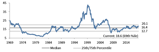 US equities (2.2% for the S&P 500 Index) climbed to new record highs in October, but underperformed broader developed markets in major currency terms for just the second month in 2019. US stocks gained 23.2% year-to-date, and 14.3% over the past year. Six of 11 S&P 500 sectors advanced, led by healthcare, information technology, and communication services, whereas energy and utilities declined the most. Growth stocks outperformed value equivalents for the ninth time in the last 12 months, while small caps bested their large-cap brethren for the second consecutive month. Third quarter earnings growth reports thus far have largely exceeded depressed expectations. Quarterly earnings are expected to decline 2.7% year-over-year, based on reports from more than two-thirds of S&P 500 constituents, which compares favorably to earlier expectations of 4.1% decline as of third quarter. Analysts now expect full year 2019 earnings growth of just 1.3%, more than 10 percentage points lower than estimates at the beginning of the year, as profit margins are expected to contract for the third consecutive quarter. The US economy expanded at a 1.9% annualized rate in third quarter, more than anticipated and in line with the Fed’s long-run growth expectation. Consumer spending continued to drive the US economic expansion, whereas business investment declined for the second straight quarter amid the uncertain trade environment. Strong jobs numbers assuaged downturn fears stemming from weak manufacturing survey data. The unemployment rate dipped to a 50-year low at 3.5% and average weekly hours—a popular leading economic indicator—were unchanged.