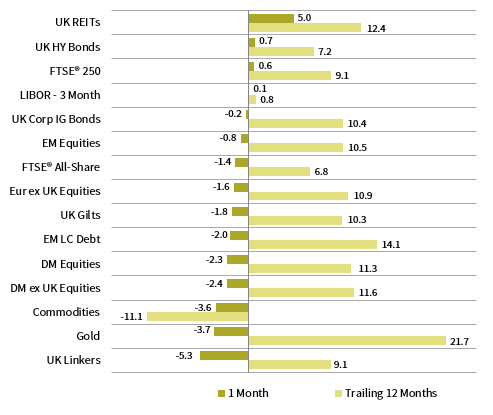 Most UK assets declined as sterling strength dented translated returns. UK equities bested Europe ex UK and DM peers, but declined overall. HY bonds bested IG corporates and UK gilts as UK yields climbed. Real assets diverged: UK REITs handily outperformed, while commodities and gold lagged.