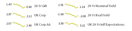UK sterling fixed income yields reflect the ICE BofAML Sterling Corporate AA Bond Index, ICE BofAML Sterling Corporate Bond Index, UK ten-year gilts, Bank of England 20-year nominal yields, and Bloomberg Generic UK 20-year inflation-linked (real) yields.