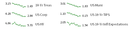 US fixed income yields reflect Bloomberg Barclays Municipal Bond Index, Bloomberg Barclays US Corporate High Yield Bond Index, Bloomberg Barclays US Corporate Investment-Grade Bond Index, and the ten-year Treasury.