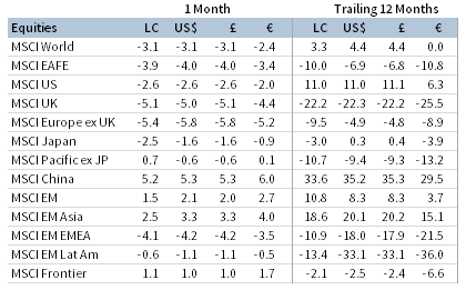 US stocks ended the month with their worst weekly decline since March, approaching correction territory from early September highs as COVID-19 cases surged and US Congress failed to pass further fiscal stimulus. The November 3 general election now takes center stage, and investors will anxiously await the result and its implications for future fiscal relief packages and longer-term policies. The US earnings season is progressing better than expected, but overall EPS are expected to decline nearly 10%. US third quarter GDP expanded a record 33.1% annualized but GDP was down nearly 3% on a year-over-year basis, with economic output 3.5% below 2019 year-end levels.