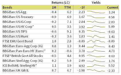 Sources: Bloomberg Index Services Limited, EPRA, European Banking Federation, FTSE Fixed Income LLC, FTSE International Limited, ICE Benchmark Administration Ltd., J.P. Morgan Securities, Inc., MSCI Inc., National Association of Real Estate Investment Trusts, Standard & Poor’s, and Thomson Reuters Datastream.