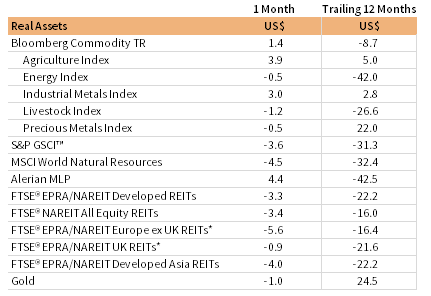 Sources: Alerian, Bloomberg L.P., EPRA, FTSE International Limited, Intercontinental Exchange, Inc., MSCI Inc., National Association of Real Estate Investment Trusts, Standard & Poor’s, and Thomson Reuters Datastream. MSCI data provided “as is” without any express or implied warranties.