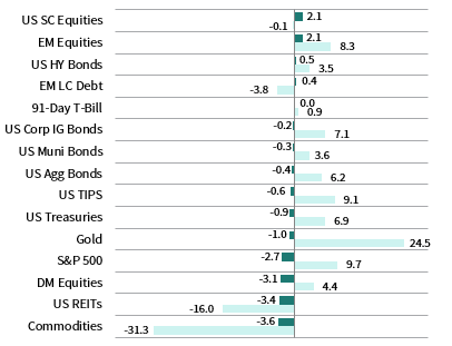 Safe havens gold and US Treasuries declined, offering little respite amid near record high prices and ultralow yields. Within fixed income, high-yield and investment-grade corporate bonds outperformed Treasuries, while tax-exempt municipal bonds and TIPS also outperformed their sovereign counterparts.